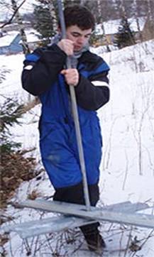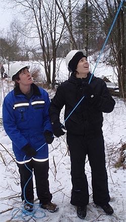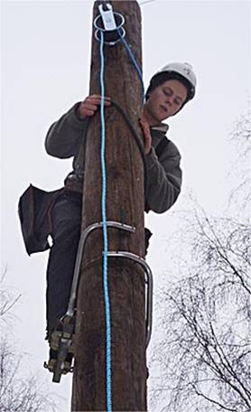 stolper med barduner, og den går mellom et inntak i skoleveggen, og et kabelskap med en utgående kurs. Stolpene er 7 m høye. Når vi klatrer i stolpene bruker vi stolpesko. Det er en teknikk som