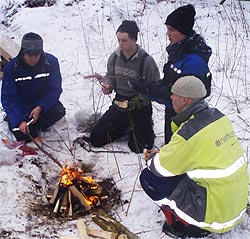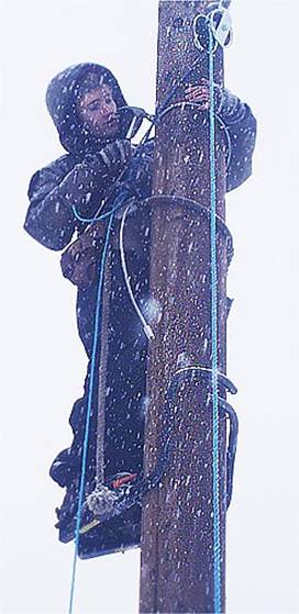 Sikkerhetstauet er viktig. Mannen i stolpen har kontakt med bakken via en mann som sikrer ham