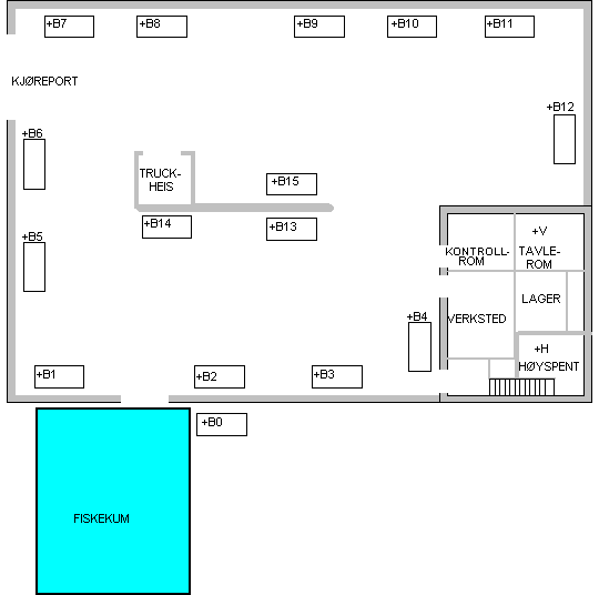 Denne tegningen viser hvor de forskjellige motorutgangene er plassert i bedriften, og hva slags kode de forskjellige skapene er merket med.