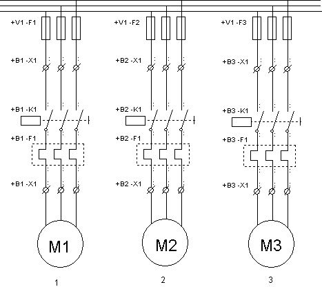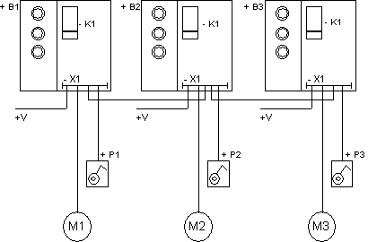 M1 skal bare kunne kjøre dersom M2 går. M2 skal bare kunne startes dersom M3 ikke går. Denne skal