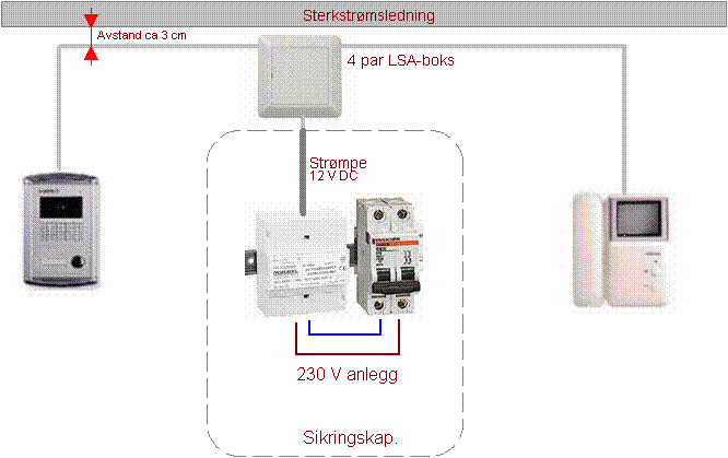 Slike anlegg tegnes med utgangspunkt i plintrelisten. De enkelte terminalene i koblingsboksen tegnes som en lang, loddrett strek. Her benytter vi en 4 par LSA- boks fra ELKO. I denne boksen kan vi plintre opp til 8 ledninger.  |