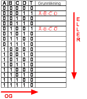 Sannhetstabellen fylles ut med de tilfellene hvor lampen skal lyse. (Kretsen