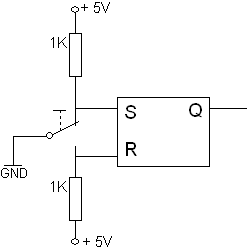En grei måte som vi kan få en sikker bryter inn i en slik krets, lager vi ved at bryteren styrer en SR – vippe.  |