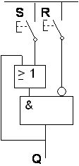 Når vi kobler styringen til motorene på denne måten, lager vi en krets som tar hensyn til dette. Vi ser at stoppknappen kan overstyre startknappen om det skulle oppstå en feil. Her er det altså R- bryteren som dominerer.  |