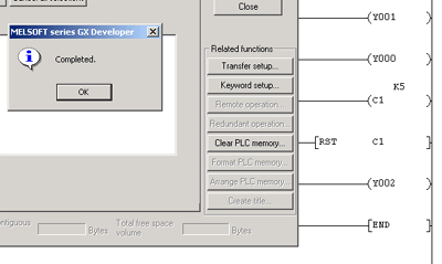 og lukk overføringsvinduet ved å klikke på ”Close”. Når du setter venderen på CPU- blokken til RUN, kan du prøve det programmet som du lastet inn.  |