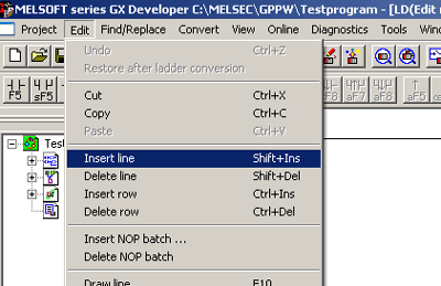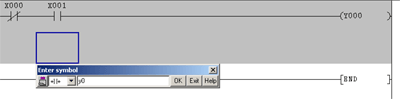 Når du har åpnet prosjektet, kommer det fram en linje som slutter i en ”End” - funksjon. Tegnemarkøren står nå på denne linjen. Gå inn på ”Edit”. Derfra kan du lage en ny linje ved å klikke på ”Insert line”. Du ser nå at det kommer fram et felt på skjermen som du kan arbeide i. Her kan du lage en linje ved å legge inn symboler og adresser. |