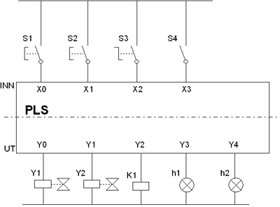 Programmet kan styre lamper, ventiler, kontaktorer o.a. dersom disse blir koblet til utgangene på PLS- maskinen. På vår MITSUBISHI- maskin kaller vi terminale til disse utgangene for Y0, Y1, Y2… o.s.v.  |