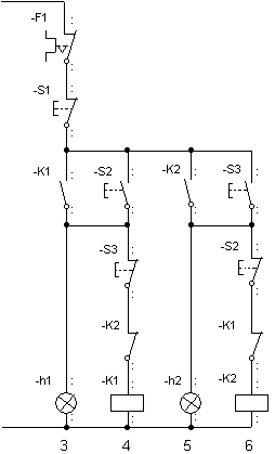 for K1, (S2) fungerer samtidig som stoppknapp for kontaktor K2.  Startknappen