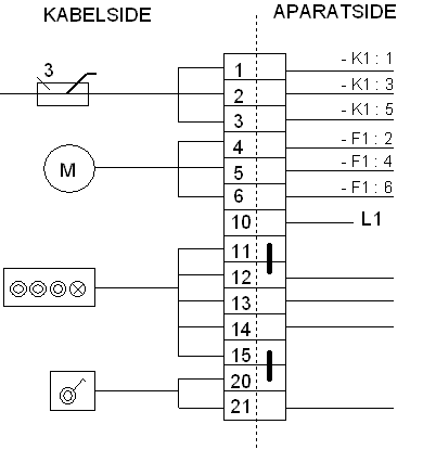 styretablå. Nødstoppbryteren kobles til klemme nr 20 og 21 KABELSIDE: Her tillates bare en ledning tilkoplet pr. klemme. APPARATSIDE: Her tillates opp til 2 ledninger tilkoplet under en felles