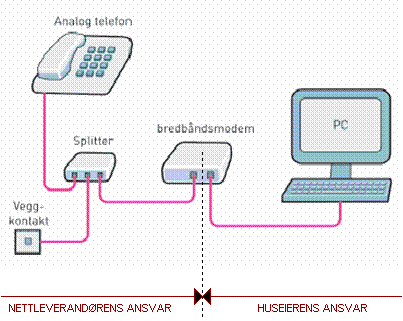 Når du kobler bredbåndsanlegget til en telefonlinje, må du sette opp en splitter. Splitteren skiller telefonsignalet fra datasignalet. Fra Splitteren kan du gå videre til et modem. Modemet gir deg muligheter til å komme ut på internett.  |