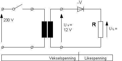 hjelp av en diode kan du fjerne den ene halvbølgen fra vekselspenningen. Du vil da få likespenning over motstanden.
