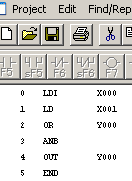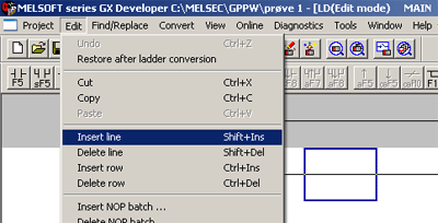 Når du har åpnet prosjektet, kommer det fram en linje som slutter i en ”End” - funksjon. Tegnemarkøren står nå på denne linjen. Gå inn på ”Edit”. Derfra kan du lage en ny linje ved å klikke på ”Insert line”. Du ser nå at det kommer fram et felt på skjermen som du kan arbeide i. Her kan du lage en linje ved å legge inn symboler og adresser. |