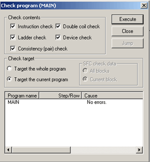 Når du utfører denne sjekken, får du kanskje beskjed om at programmet ditt ikke inneholder noe tull. Det betyr bare at PLS- maskinen forstår det du har laget. Maskinen vet selvsagt ikke om dette programmet virker slik som det skal. Det ser du når du prøver programmet på anlegget ditt. |